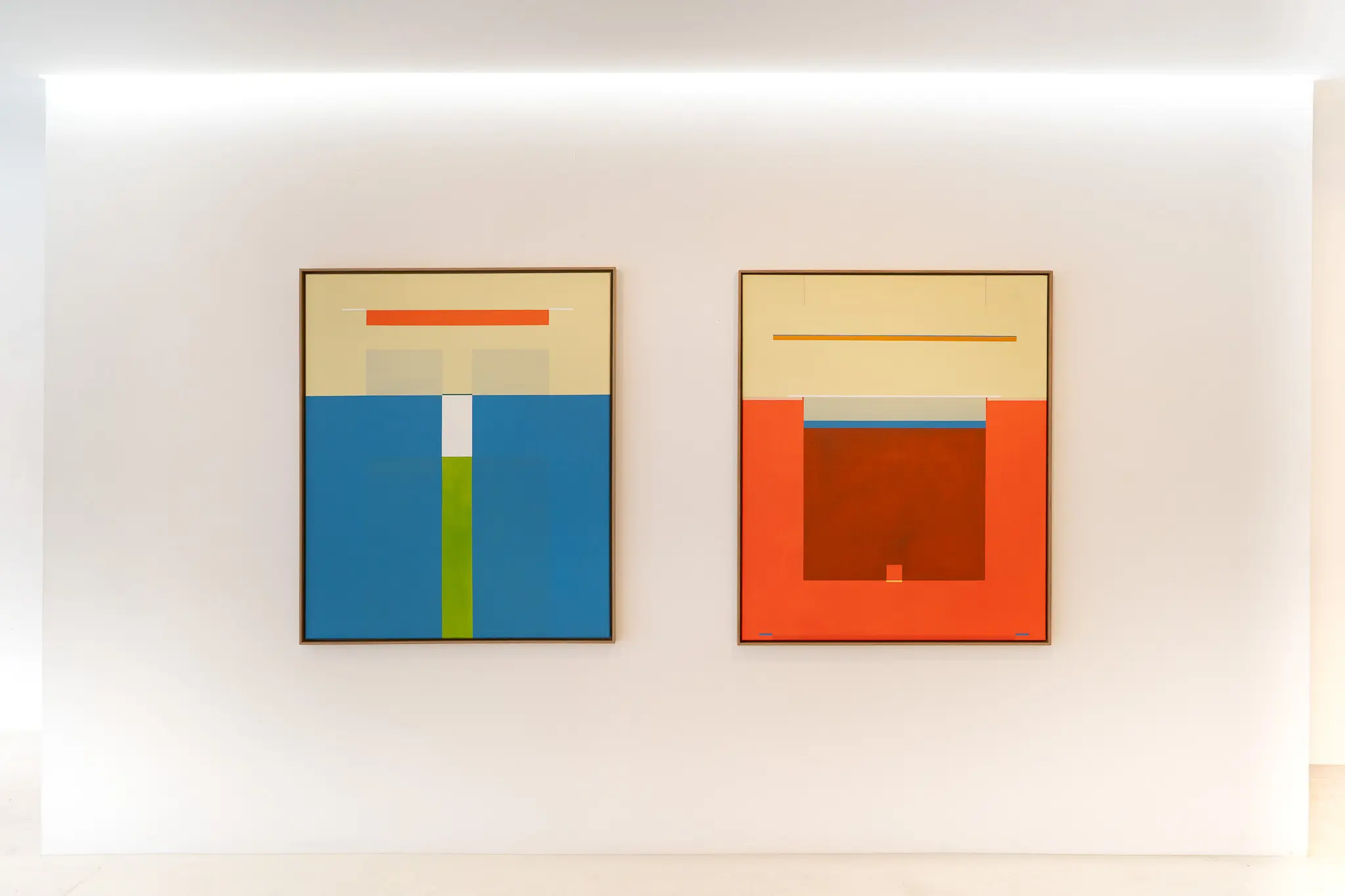 Sard’s works continue to be minimal and abstract, constructed through planes of colour and a refined geometric vocabulary. Canvas now joins his habitual materials, bringing its own painterly resonance to the installation. Influenced by pop visual culture, comics, and cinema, Sard’s vivid colours establish a dialogue between two- and three-dimensional forms. In the sculptures, colour enhances tri-dimensionality, activating visual pathways and internal voids; in the wall works, it expands into broad chromatic fields where warm and cool tones intersect, overlap, and occasionally reach a vibrational threshold through complementary contrasts.