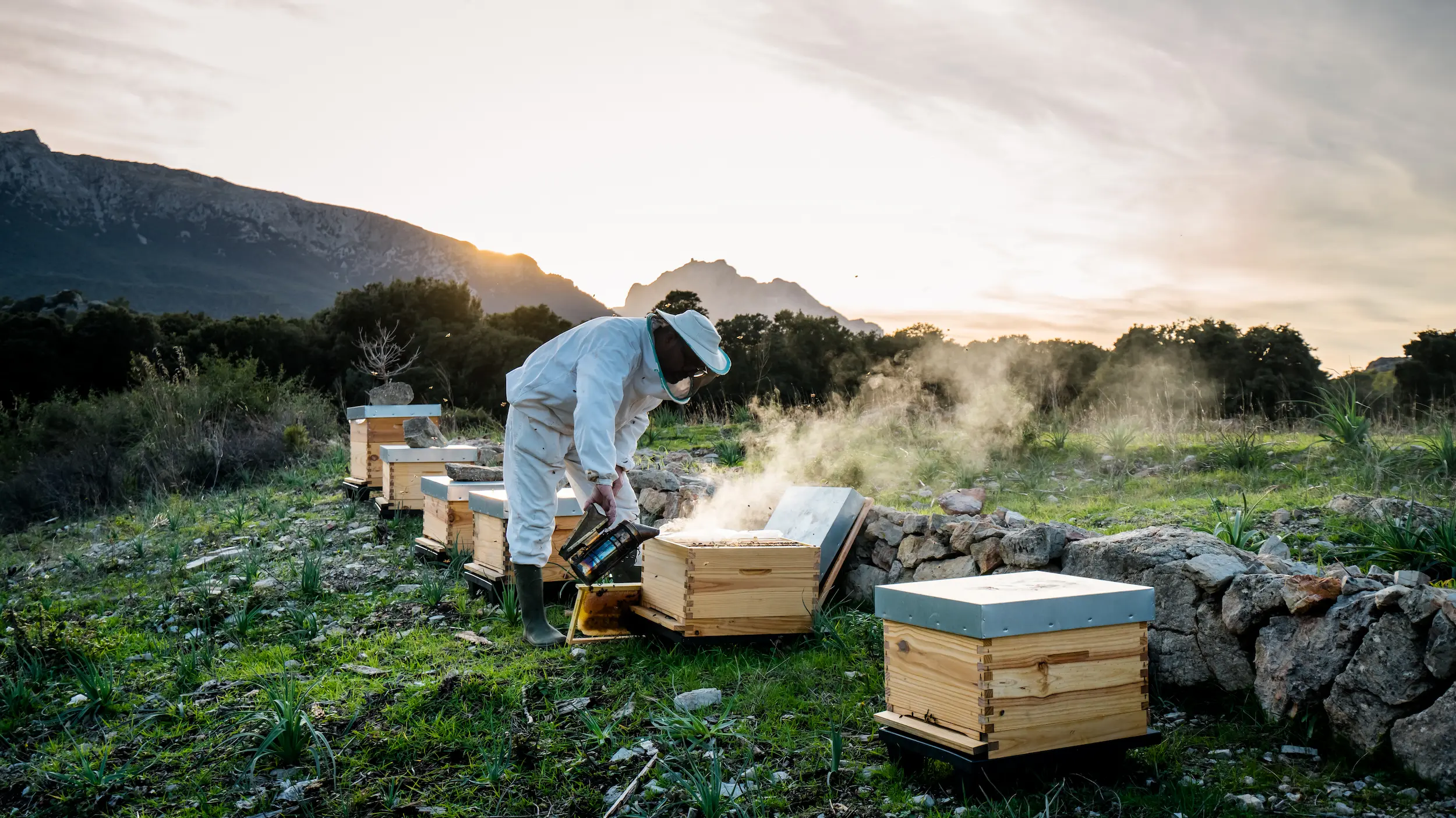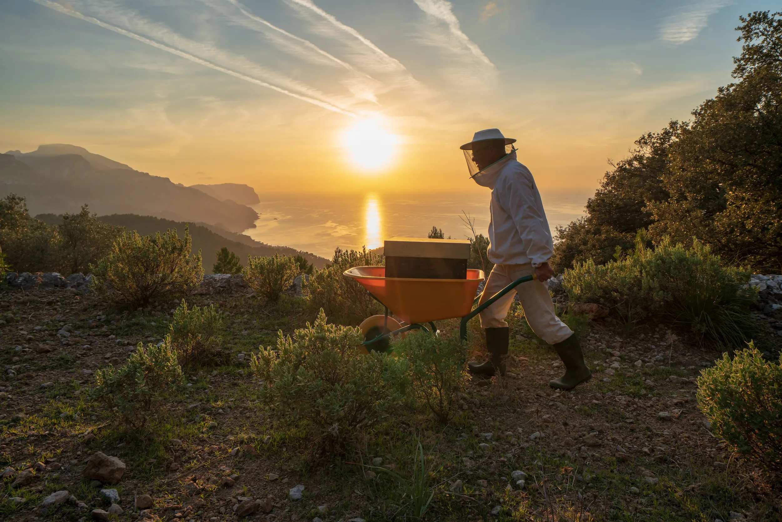 earing a woolly hat pulled down over his bald head and thick black-rimmed glasses, Marti drives us to Monnaber Vell, an agroturismo where he keeps a few beehives. The name Monnaber Vell comes from Arabic and means ‘mountain of flowers’. The path winds through the foothills of the Tramuntana mountains; the hives stand on rocky, limestone ground where sheep graze among carob trees, olive trees, a few fig trees and asphodels, which have not yet bloomed in January. "Ten years ago, there were lots of almond trees here. Everything looked like it was covered in snow, but they are disappearing. Many have died and those that remain produce only a few flowers. “They are being replaced,” Marti continues, “by American varieties. But for the bees, it's not the same: the Mallorcan varieties bloom in January, while the American ones only bloom in March."