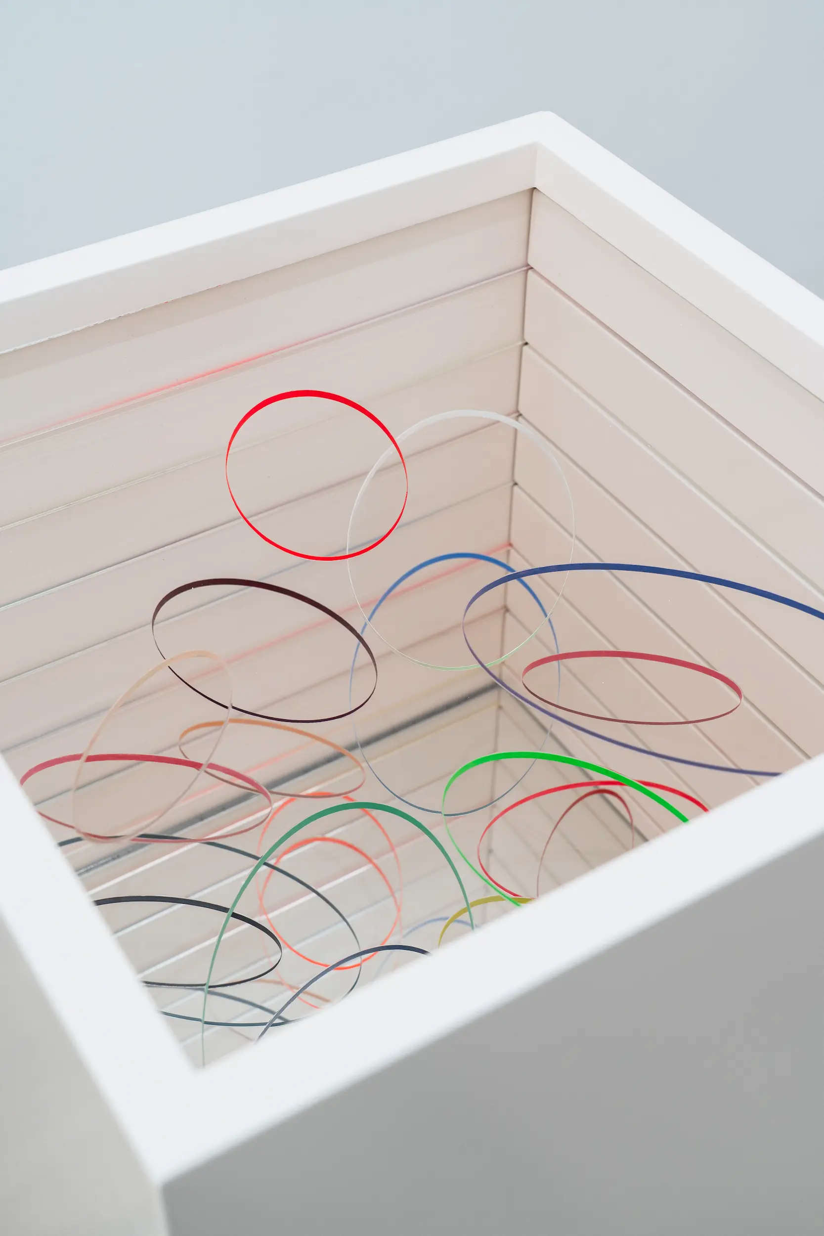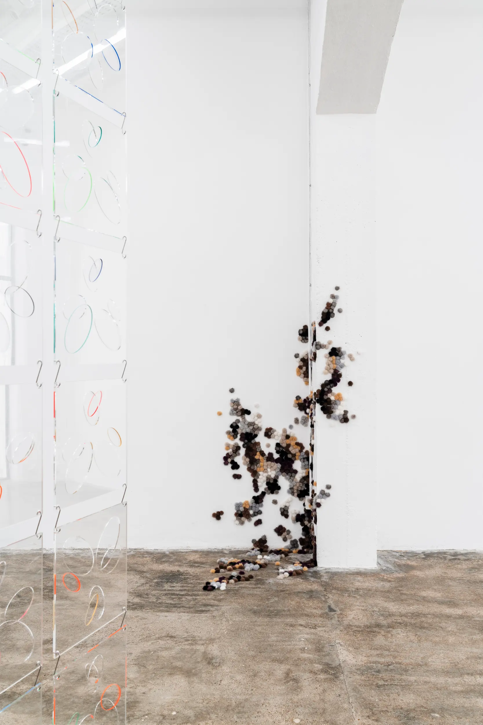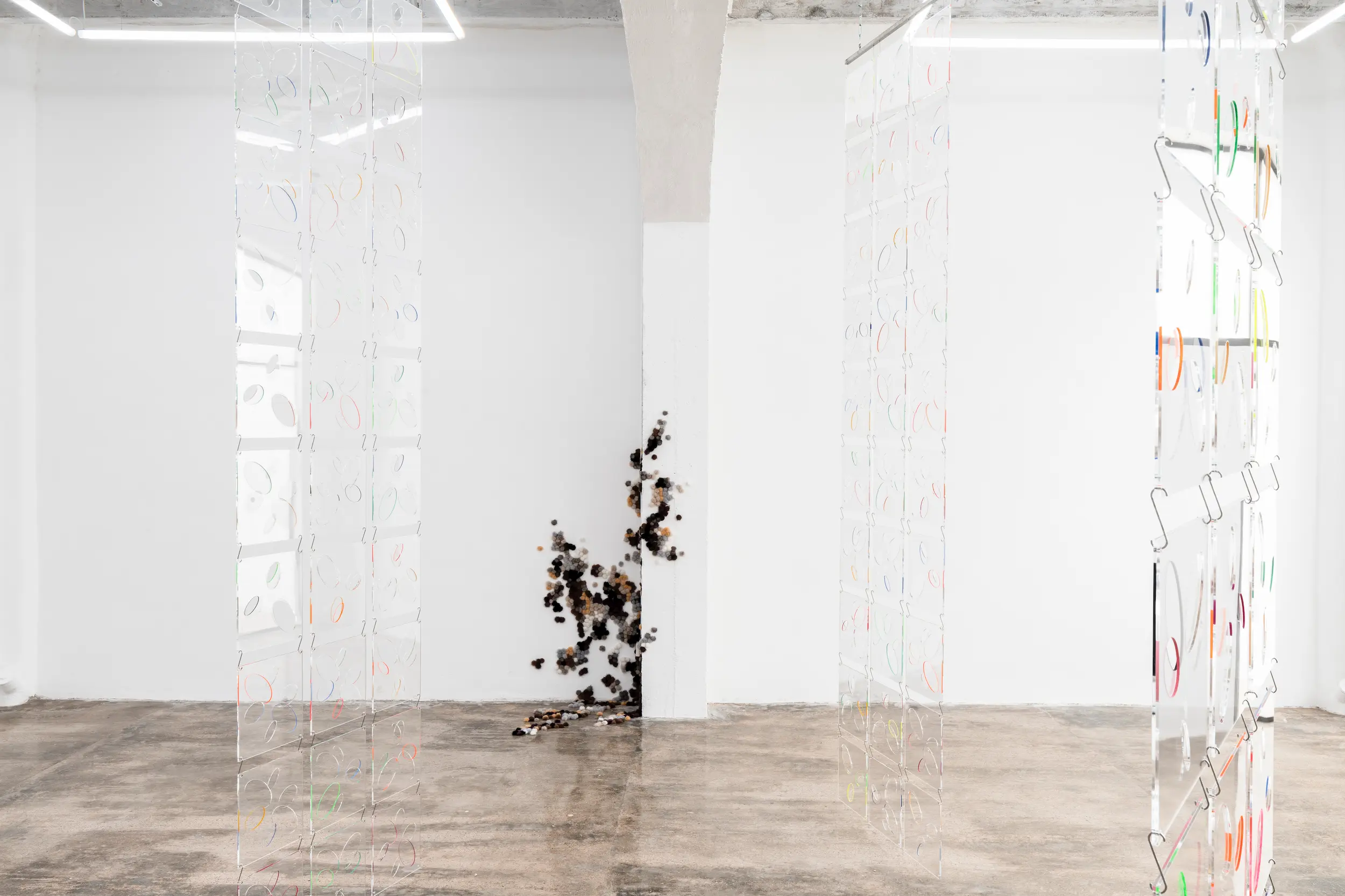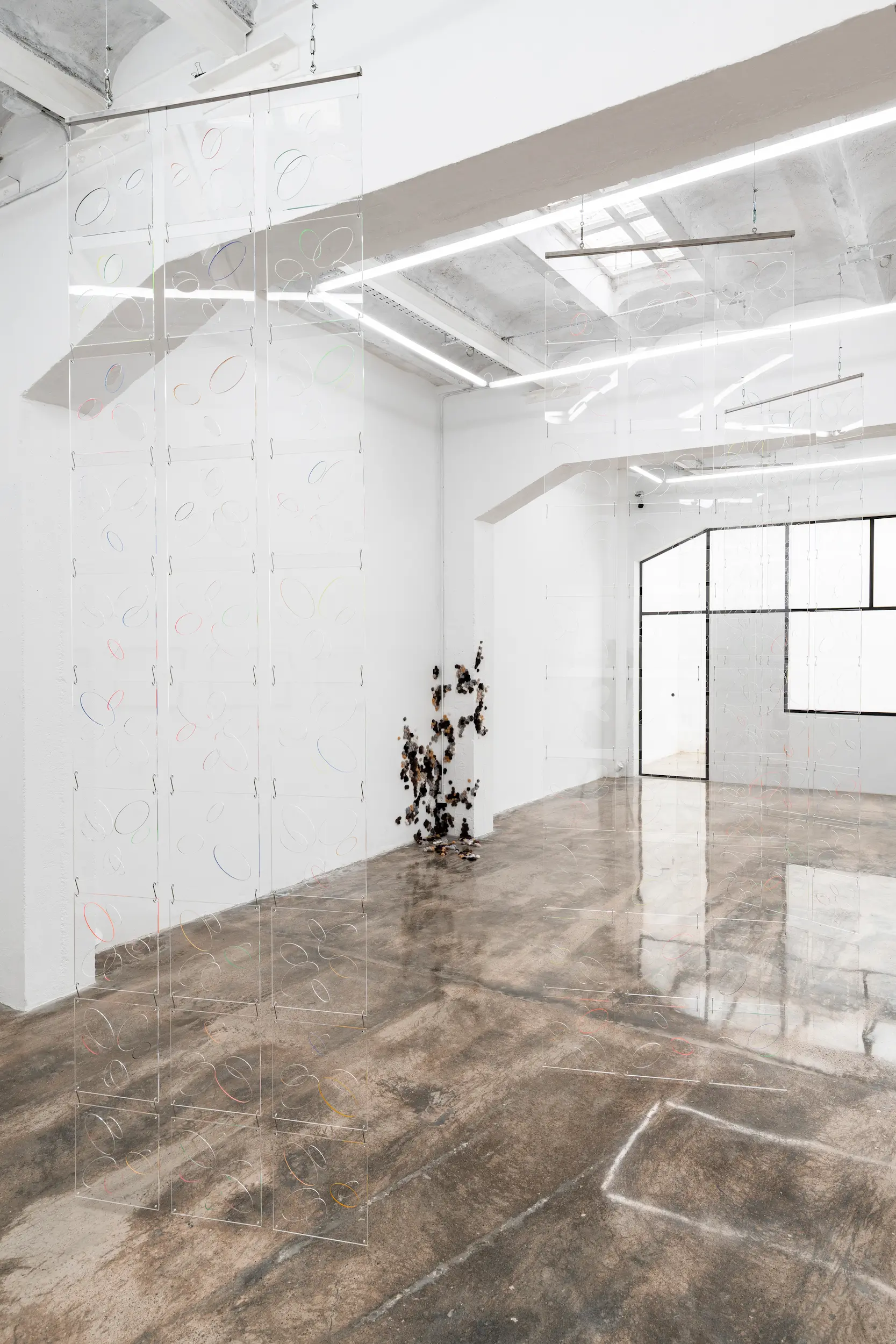 In Spinning Rumours Ópalo, Arocha and Schraenen take the opal as a starting point, drawing on both its refractive physical qualities and the many meanings attributed to it throughout history. Long associated with ideas of creativity, protection and spiritual vision, but also with misfortune and uncertainty, the opal sits between myth and material reality. Playing with this tension between the esoteric and the empirical, the artists invite viewers to experience how colour, light and reflection can alter perception. Anchored by large translucent hanging screens and a site-specific plexiglass installation that reshapes the gallery space, the exhibition unfolds as an immersive abstract environment that gently invites viewers to reconsider how we perceive and interpret reality.