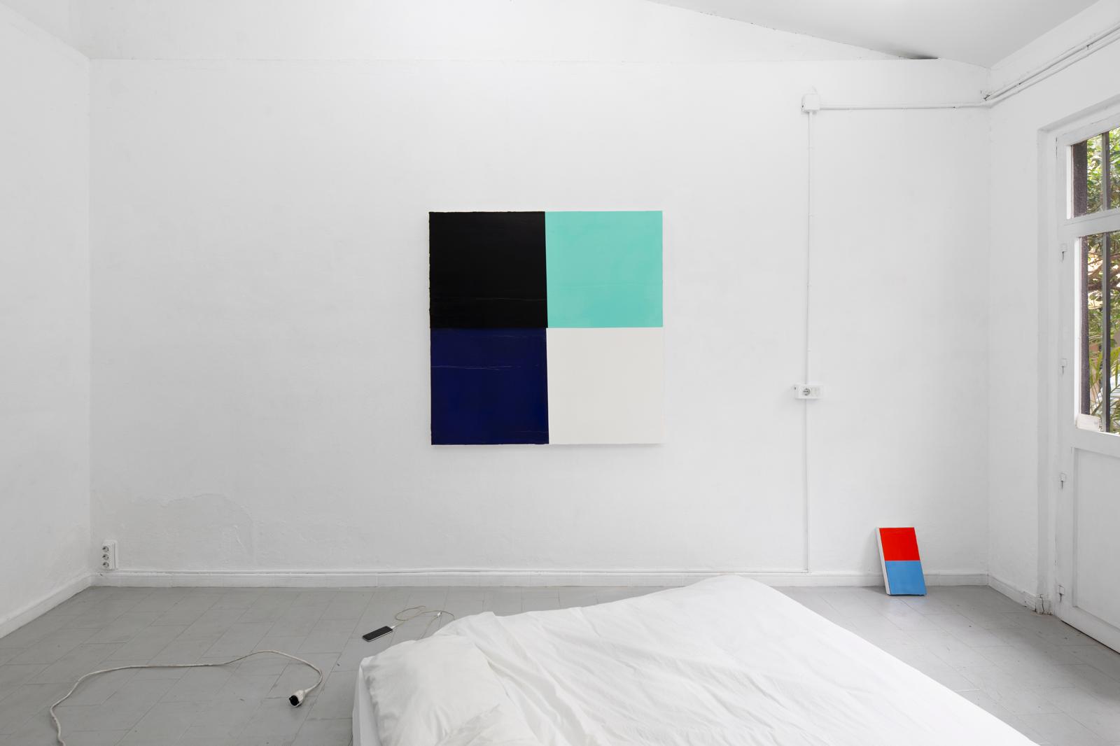 Román Fabré’s pictorial practice is based on a daily investigation of scale, color, form, repetition, and accumulation—explorations that inhabit the space between figuration and abstraction, materializing in different ways: from color-field compositions to large-scale geometry. Despite being occupied, the bed functioned as a monochrome in this context. Leaving the exhibition, one encountered the chatter and conversation that would normally take place inside the room. Shortly after, the two performers awoke from their self-induced sleep and joined those conversations. Perhaps the performance ended exactly where the need to meet others began.