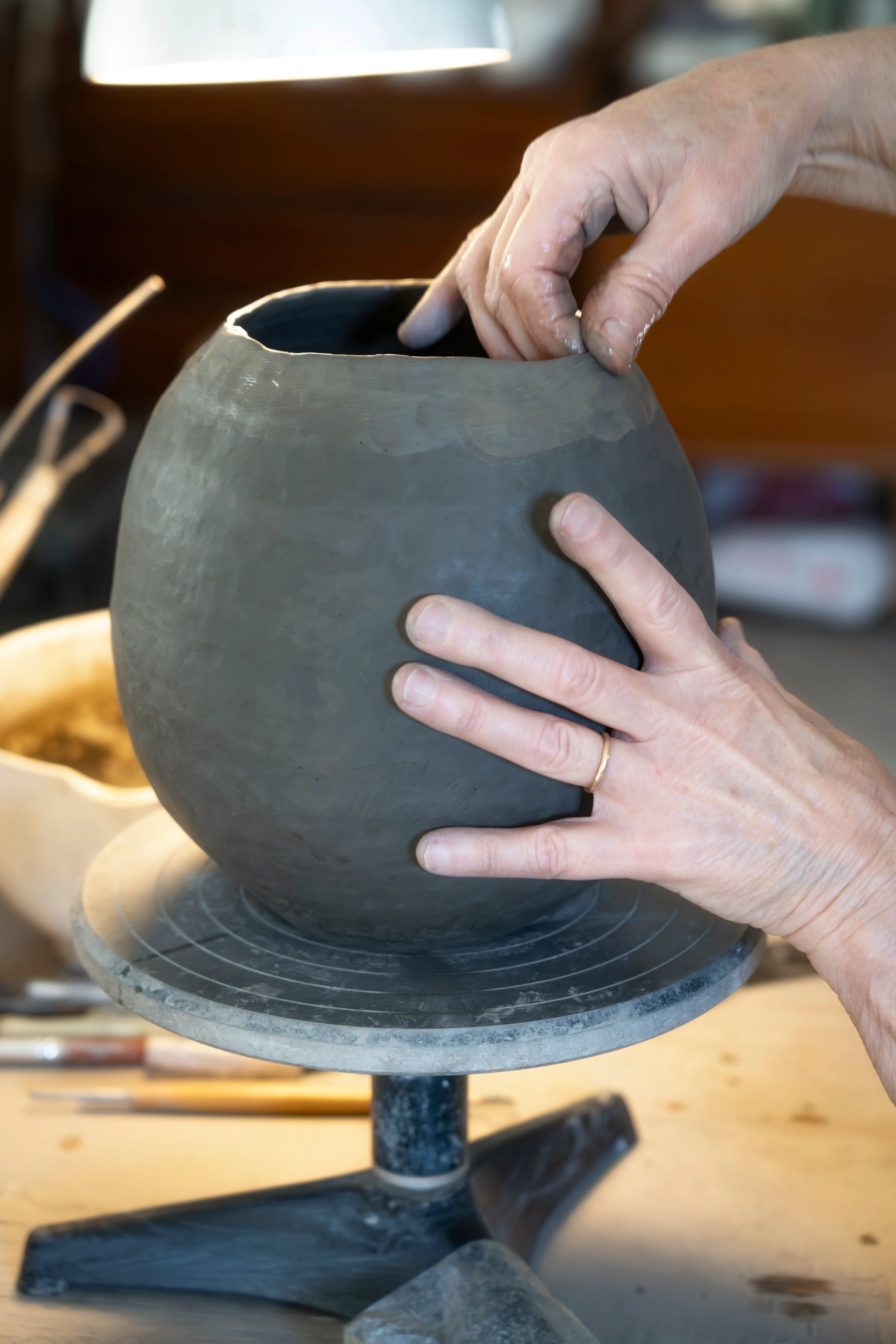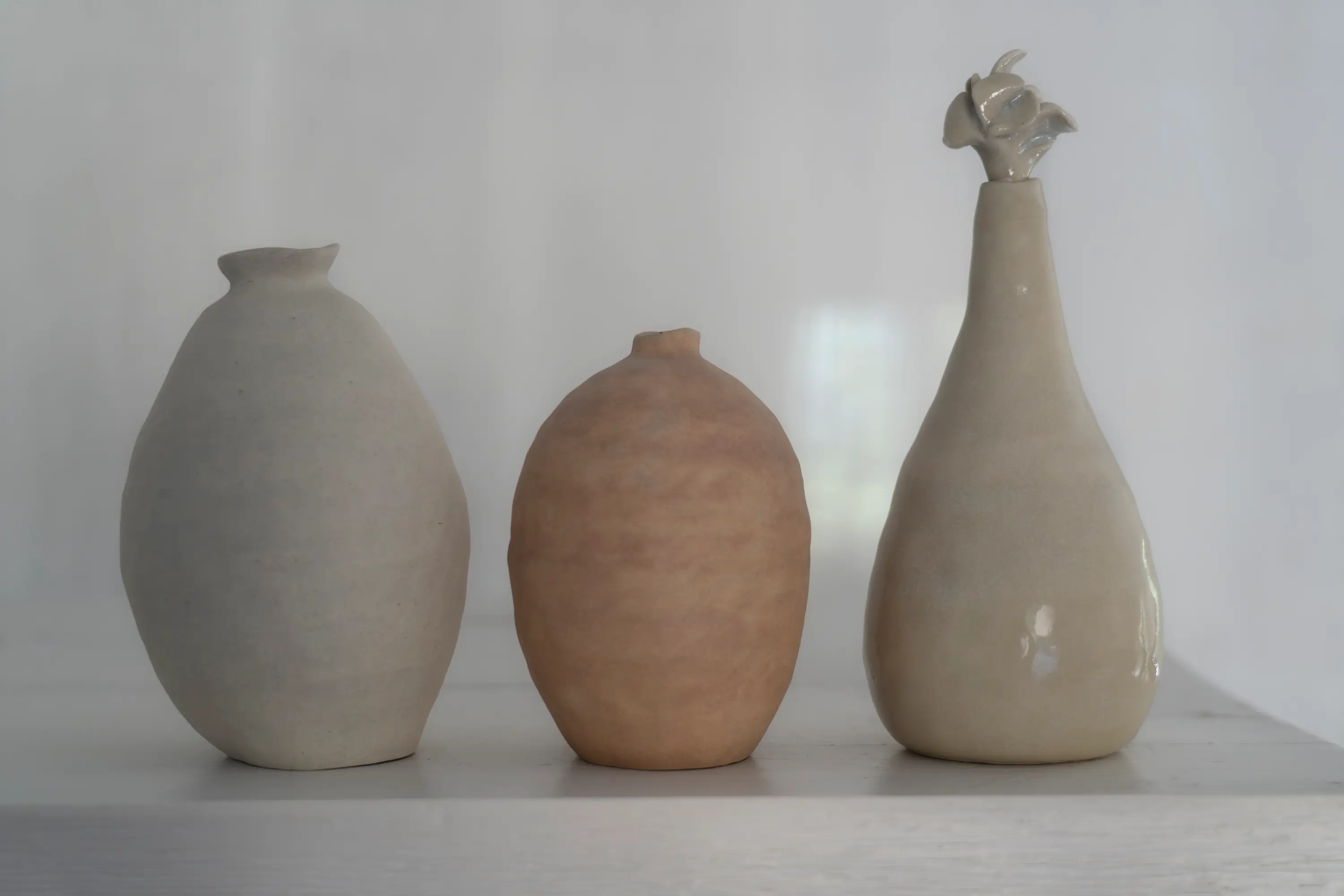 Skantz creció en el seno de una familia de creativos, como suelen hacer muchos artistas escandinavos, con un espíritu de bricolaje en el que coser ropa, tejer o fabricar muebles era solo parte de la vida cotidiana. Tomó clases de arte y se sumergió por primera vez en la cerámica cuando asistió a una clase en Poble Español, cuando todavía estaba lleno de estudios de artistas. Comenzó a hacer vajilla (platos, tazas y cuencos), y se interesó por el proceso de pintar con láminas. Sus primeras piezas reflejan su sensibilidad escandinava, con patrones minimalistas pero gráficos: rayas, cuadrículas y puntos, figuras en un paisaje. Aprendió a tocar la rueda, pero rápidamente comenzó a construir a mano y trabajar con bobinas. «Aprendí a usar la rueda, pero no por mucho tiempo, ya que no me atraía», dice. «Para mí, enrollar y construir a mano es algo más vivo. Tiene más textura y se pueden ver los ritmos, las marcas y las huellas. Siento que son más únicos».