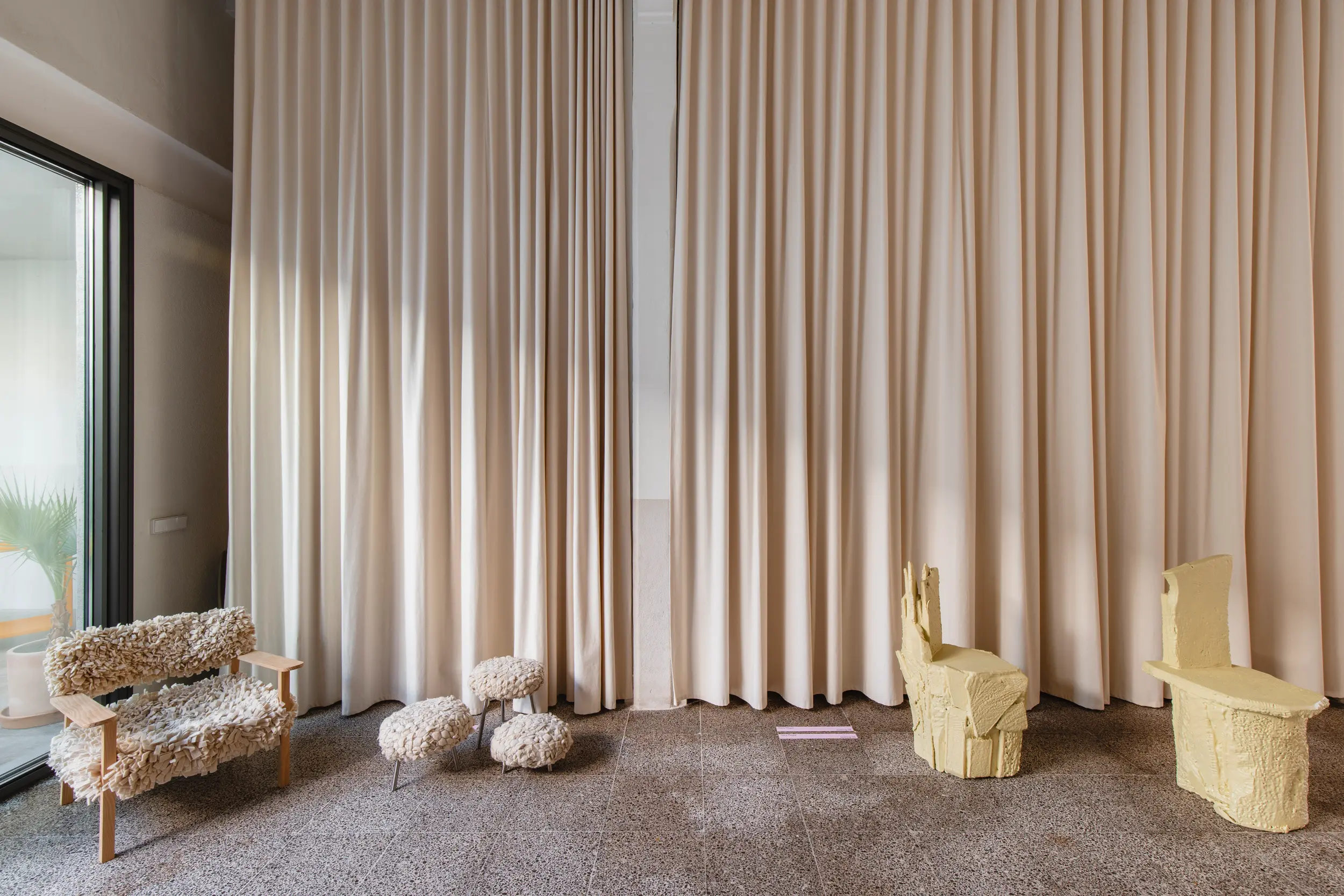 Una de las primeras piezas con las que se encontraron los visitantes fue una impresionante silla escultórica de metal azul de Estudio 2 Monos. 'Swing Chair' es un estudio de geometría y una interpretación lúdica de una silla diseñada para dos personas que deberían estar listas para balancearse de un lado a otro gracias a su improbable soporte circular. Nicoletta Mantoan y Alexander Dumon explican que la silla «ofrece nuevas formas de relacionarnos con estos objetos y las emociones que despiertan en nosotros, difuminando las disciplinas y expresándose a través de una fusión de arte y diseño». Si «Swing Chair» requiere una conexión entre dos personas para que funcione correctamente, el sillón «Nus» de Alex Maestre y el conjunto de tres taburetes titulado «Dessac» pretenden establecer una conexión entre el usuario y la naturaleza, y particularmente el paisaje mallorquín. La silla, hecha a mano en madera de pino local, está revestida de suave lana natural de oveja y los taburetes, que tienen una base de malla y metal, utilizan lana de oveja para crear también la forma y la estructura. Los usuarios están envueltos en la lana que «nos conecta con el ecosistema y la tierra, creando un vínculo emocional entre los muebles y el territorio», como dice el diseñador.